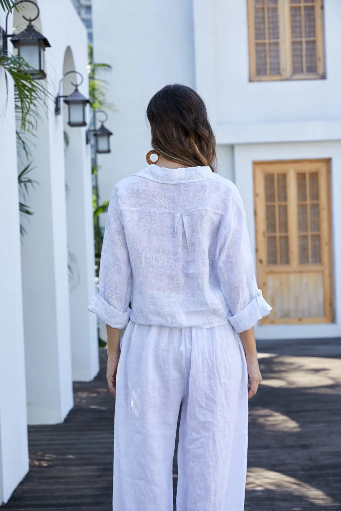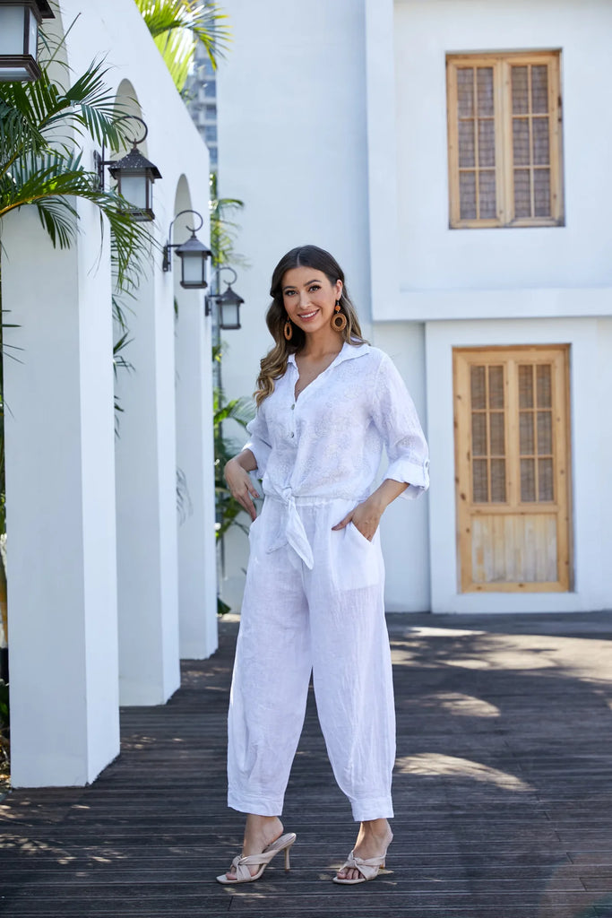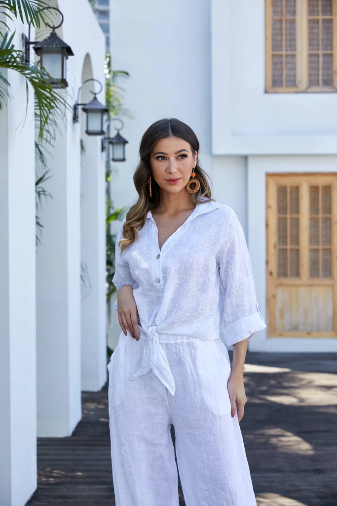 The Orange by Fashion Village Safari Linen Top features a chic floral print and a trendy tie-up front. With roll-tab sleeves and a casual style, this modern take on a safari top is the perfect addition to any wardrobe. Elevate your style with this must-have top.