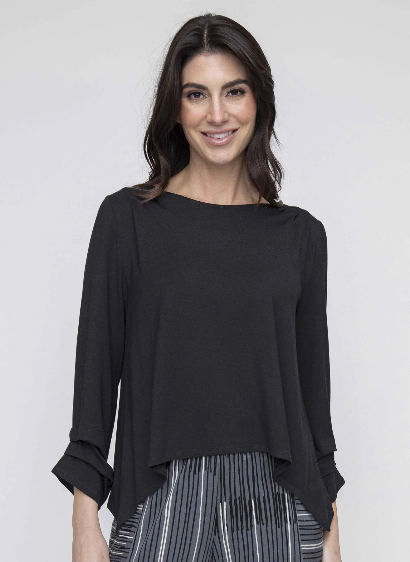 The Liv Pleated Topper is Sexy and Flattering. It features strategically placed pleats making this top loose and relaxed. The round neckline is enhanced by shoulder pleats that create a lovely drape down the body to the swinging shark bite hem. 3/4 length sleeves end in gathered pleats for a feminine finish.