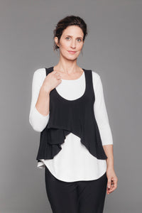 The Sympli Crop smock is a layered, asymmetrical wrap with rounded hem and removable pocket. A unique layering piece to compliment and liven up any basic.
