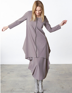 A longer length, architectural tunic with a scoop neckline, long sleeves and pointed sides. Full length front zipper. Made from soft Italian microfiber jersey.