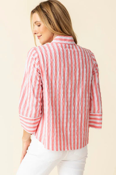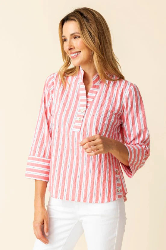 The Habitat Half Placket Pullover has a fresh new silhouette in travel-friendly crinkle cotton/spandex. It features agoya shell button deals, a flattering stand up collar, contrasting stripe cuffs. It has a rounded hem and a slightly longer length at the back.