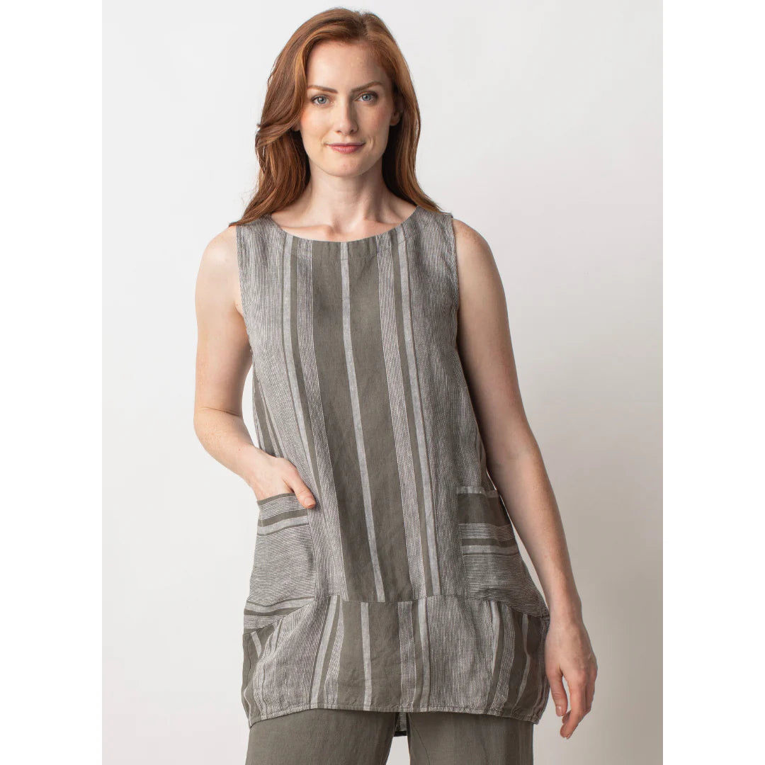 The Liv tunic length tank top with bottom piecing detail adds interest by playing with its variegated striped fabric.  It features those all important pockets and a flattering neckline. Wear over capris, its coordinating pants, or slim skirt, its your choice!