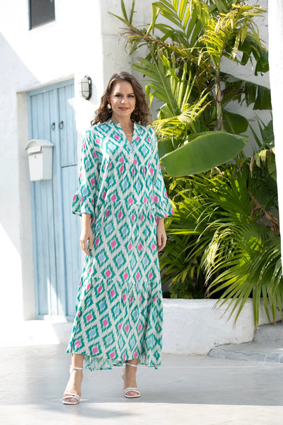 The Orange by Fashion Village Donata Maxi Dress is cool and fresh! It has high v neckline with 3/4 bell sleeves with a ruffle. It features a 3 tiered loose fitting silhouette making it flattering on many body types.
