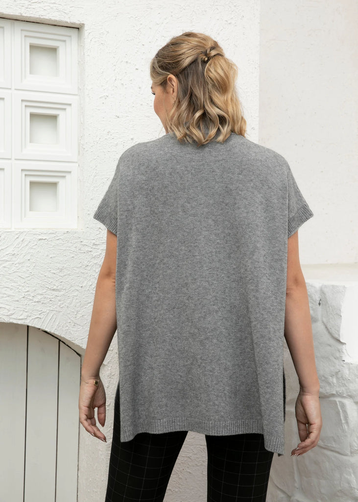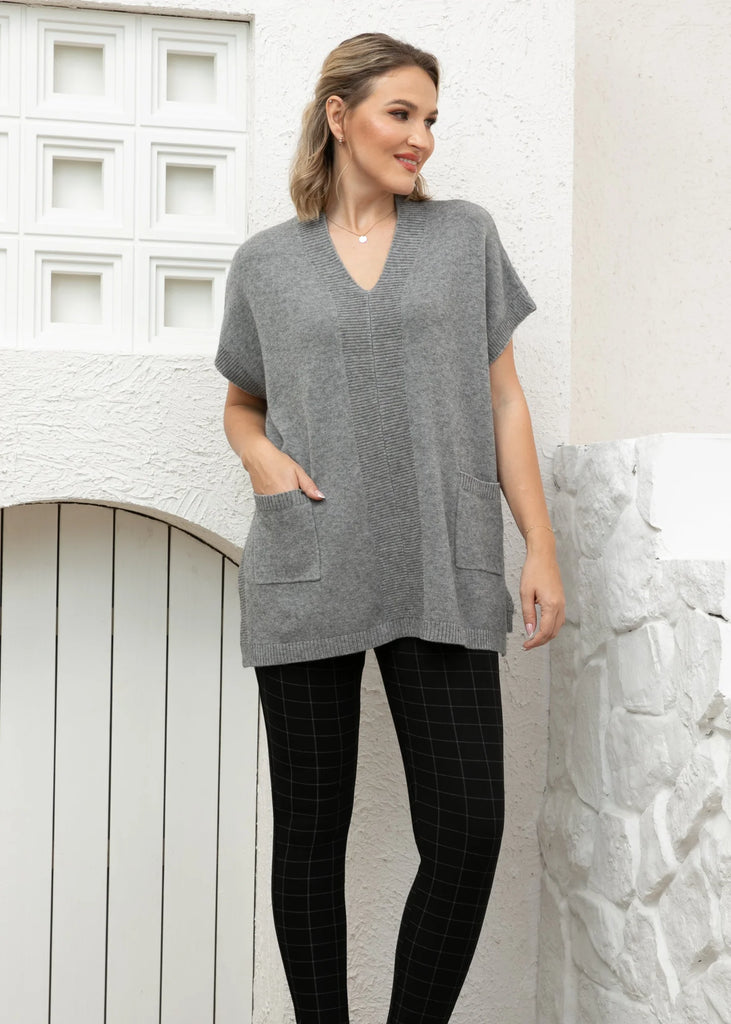 The Orange by Fashion Village Short Sleeve Topper has a deep v-neckline and two large front patch pockets.  It features side slits with ribbing down the front and along the hemline and edges.  Perfect to wear alone or as a topper piece over any long sleeve shirt or sweater.