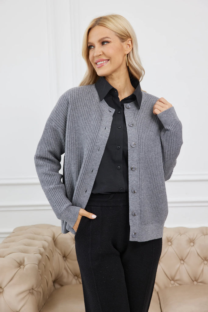 The Orange by Fashion Village Melissa's Ribbed Cardigan will keep you warm without compromising on style. Designed with a cozy ribbed knit and made to keep you comfortable through crisp fall mornings and chilly winter nights. It has buttons down the front with long sleeves and a round neckline. This cardigan blends timeless style with everyday practicality.