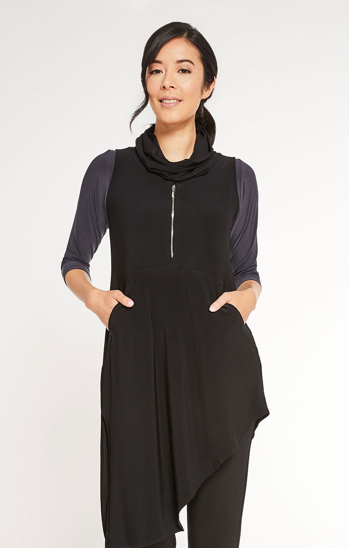 The Sympli Zest Smock features a dramatic asymmetric hemline, longest on the right side. It's perfect with any of Sympli's leggings or pants. It features a decorative zipper below the cowl neck, roomy (sleeveless) arms, and thick straps. A curved seam leads to two angled front pockets. Side slits for ease of movement. A great piece to add to your wardrobe that you can dress up or down.